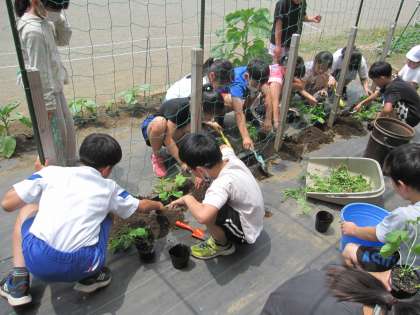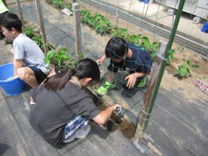 まきひげがのびたので、ツルレイシを花壇に植え替えました。枯れるまで継続して観察していきます。