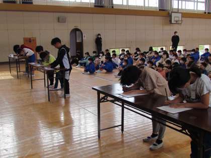 5月25日(木)JRC登録式 公開日 2023/05/25 更新日 2023/05/25 2025できごと 今日の朝は体育館に集まって【JRC登録式】からスタートです。児童会役員が司会進行をし、クラスの代表が署名用紙に名前を書きました。今日から東小っ子はJRCの一員です。