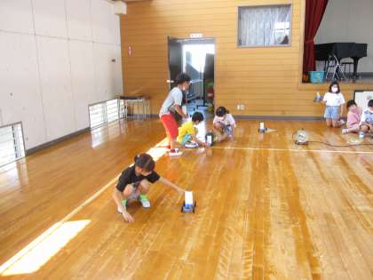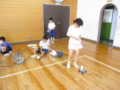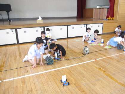 車に当てる風の強さをかえたときの車の進むきょりのかわり方をくらべながら調べました。