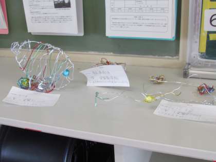 5年生は【自分の作りたいもの】ということで、各自が思いついた【ワイヤーアート】を作りました。一人一人がイメージ図を描き、そのイメージ図に沿って試行錯誤しながら完成させました。さて、どんなものを作ったか、わかりますか?