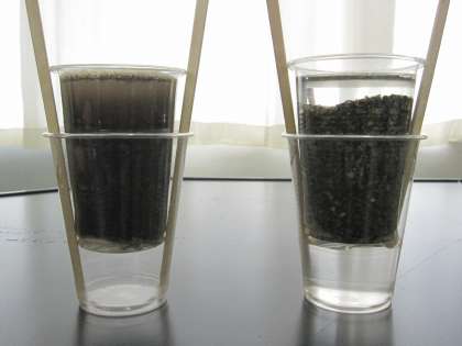 左が土、右が砂です。しみこんだ水は、下のコップにたまります。