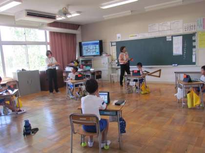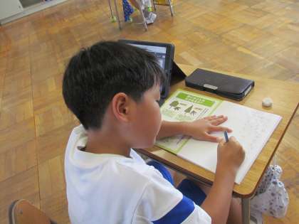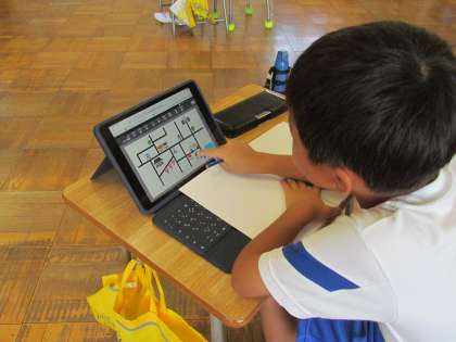 国語【ことばでみちあんない】の学習をしています。タブレットの中の地図の好きな場所に自分の家を置き、学校から家までの道案内を考えます。さて、友達を自分の家まで案内できたかな?