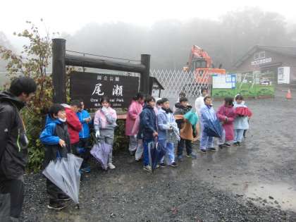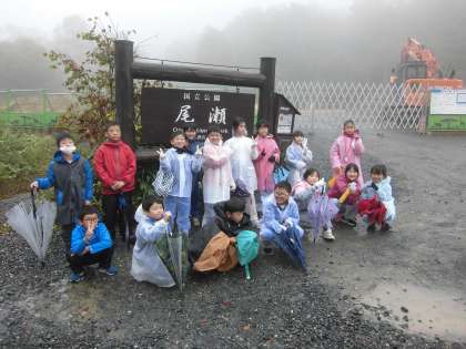 バスから降りて、少し歩いて尾瀬ヶ原の入り口に行ってみました。尾瀬の看板の前で記念写真です。