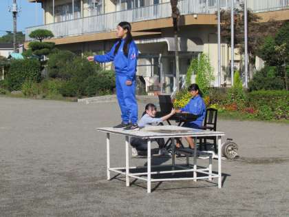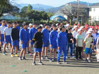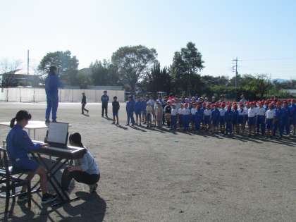 雲ひとつない青空の下、【表彰会礼】を行いました。まずは久しぶりに全校で校歌を気持ちよく歌いました。