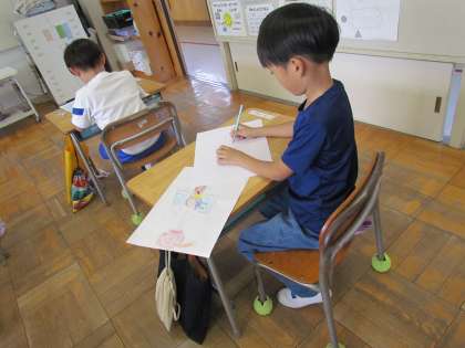 【のりたいものをかこう】ということで、思い思いに楽しそうに絵を描いています。竜やうさぎ、くじらやかめ、想像力の豊かさにびっくりします。