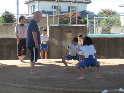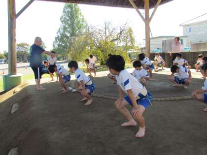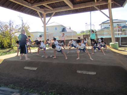 今日から3年ぶりの【相撲学習】が始まりました。以前から講師でお世話になっている先生にきていただき、まずは1.2年生が土俵の上で歴史を学んだり、元気に四股を踏んだりしました。