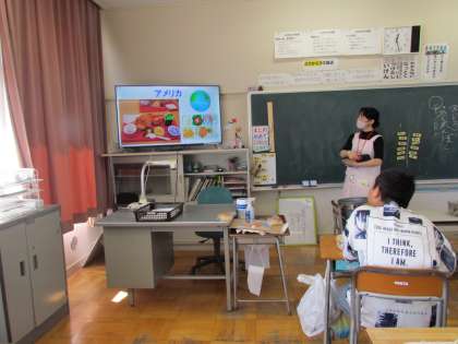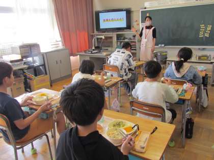 さつまいもの入ったシチューをおいしくいただきながら、給食センターの方が給食指導をしてくれました。今日は食事のバランスについてです。体を作る食事だということをいつも意識しながら、食べられるといいですね。
