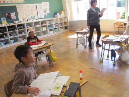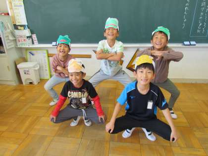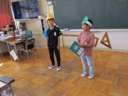 【お手紙】の中のかえる君とがま君になりきって、みんなで役割演技をとても上手にしています。頭につけたお面がやる気にさせます。