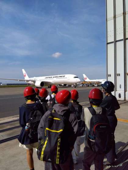 飛行機のすぐ近くまで行って、飛行機や整備について話を聞きました。迫力満点でした。