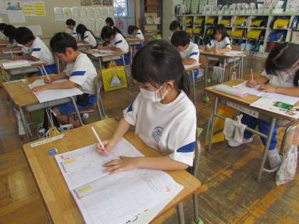 ひらがなが書けるようになり、漢字の練習が始まっています。姿勢よく、鉛筆をきちんと持って、集中して取り組むことができています。
