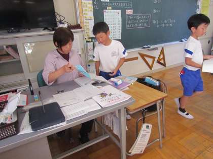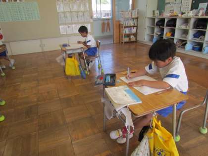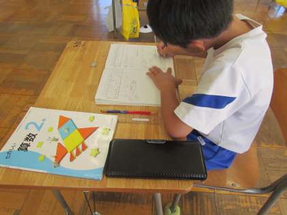 今日は【4の段のかけ算】です。しっかりとまとめと復習をしてから、教科書にある問題を解いて、先生に丸をもらいます。