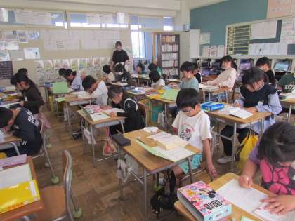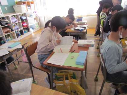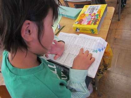 辞書を使って言葉の意味調べをしています。たくさんの言葉が載っていて、探すのは一苦労ですが、目を皿のようにして言葉を一生懸命に探していました。全部見つかったかな?