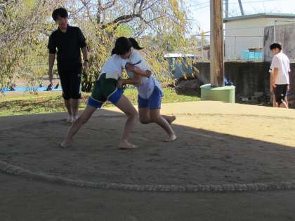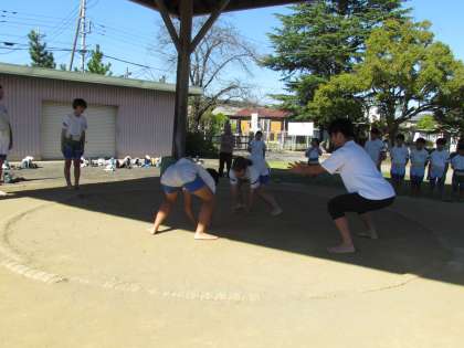 相撲学習も3時間目になりました。ずいぶん取り組みが上手になりました。体が大きいので迫力があります。