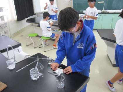 11月6日(月)5年理科 もののとけ方(その1) 公開日 2023/11/06 更新日 2023/11/06 2025できごと 食塩の水よう液とミョウバンの水よう液をろ過しました。 はじめに、4つに折ったろ紙を水にぬらしてろうとにはめます。
