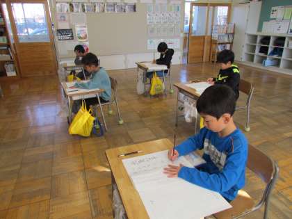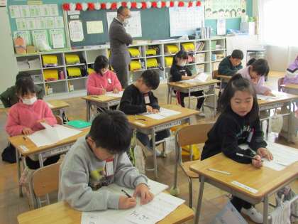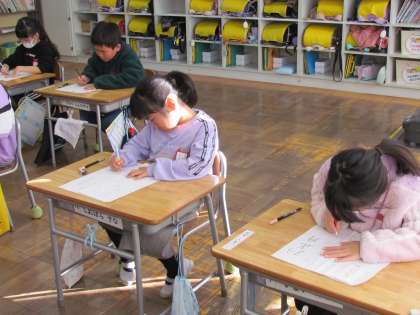 1年生と2年生はこう筆です。ペンと鉛筆で、お手本を真剣に見ながら書いています。上手に書けたかな?