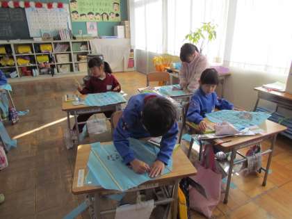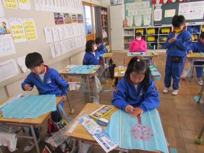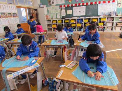1年生は【たこ作り】に夢中です。自分の【たこ】に好きな絵を一生懸命描いています。5時間目に校庭で【たこあげ】をする予定ですが、さてどうだったかな?