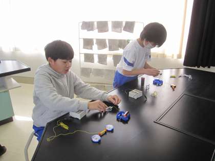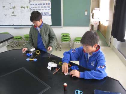 電流の向きと電磁石の極のでき方の関係を調べました。