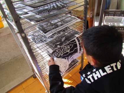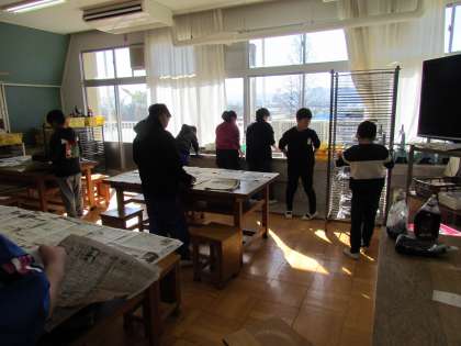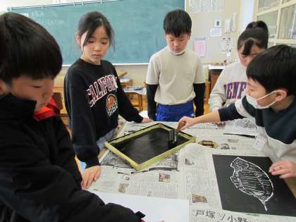 【木版画】の仕上げに取りかかっています。初めて使った彫刻刀もたくさん彫って上手になりました。