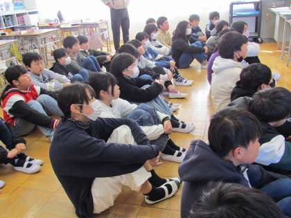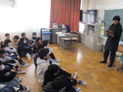 5.6年生はリズムのよい落語調のお話を聞かせてもらいました。言葉あそび的な要素もあって、楽しそうに聞いていました。