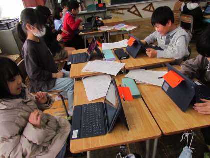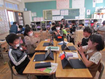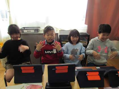 班に分かれて、【手話】を使って歌を歌っています。それぞれの班で違う曲に取り組んでいるので教室にはいろいろな歌声が聞こえてきます。どの班も発表に向かって一生懸命です。