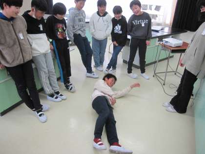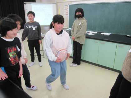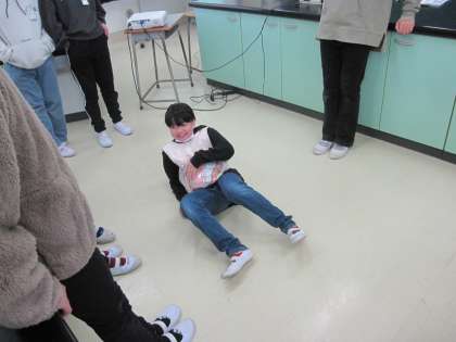 「重た〜い!」と言いながらやっと動いていました。妊婦さんの大変さがわかったようです。