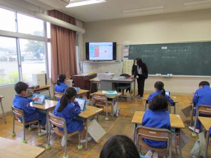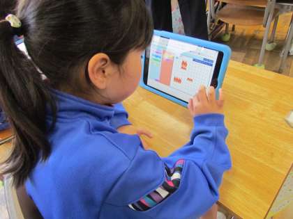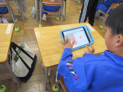 1年生もプログラミング学習です。こちらは画面に出てくる課題をどうやったらクリアすることができるのか、考えて動かすといった内容でした。真剣に画面を見て取り組んでいました。
