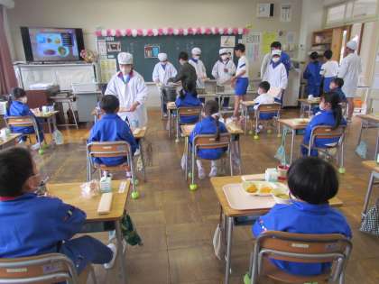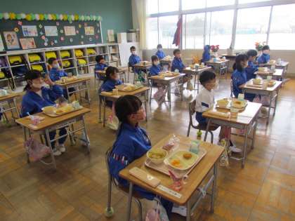 今日から給食がスタートしました。1年生は何もかもが初めてづくし。今週は6年生がお手伝いに入りました。さすが6年生、テキパキと準備のお手本をやって見せてくれ、あっという間に給食の準備ができました。見て、待っていた1年生もとても静かでした。