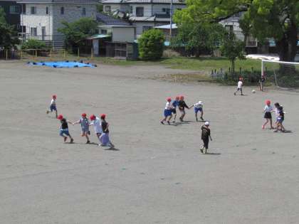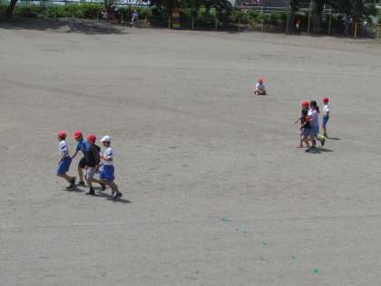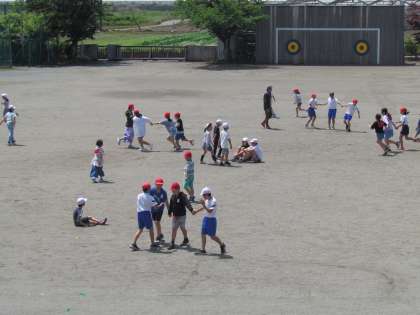 外を見てみると、校庭の真ん中で5年生がクラスレクをしています。手をつないで元気に走り回っていました。