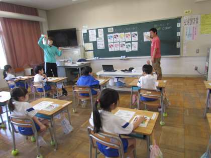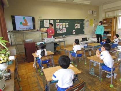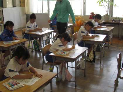 【英語で色を言おう】の学習です。テレビの画面にいろいろな絵が映し出されます。それを見て、何なのか、そしてその色は何色なのか、元気よく発表しています。そのあとはワークシートのにじの絵に色塗りをしました。