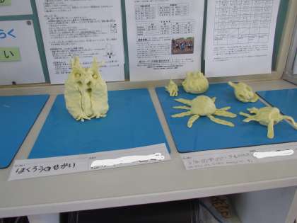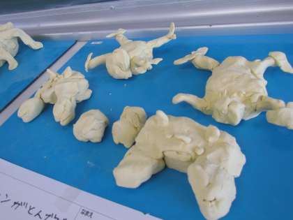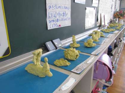 2年生の教室の後ろに、生き生きとしたねんどの作品が並んでいます。一人ひとりが自分の考えた世界を作品に仕上げています。