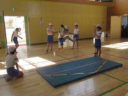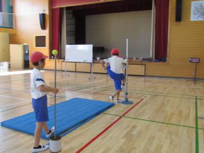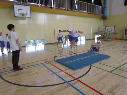 【走り高跳び】に挑戦中です。今日は【自分の跳べる高さを知ろう】というめあてで、目盛りを見て自分が跳べる高さを確認しながら、跳ぶことができました。