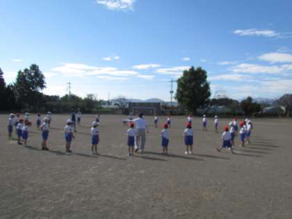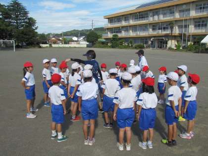 今日は校庭で隊形移動をしています。体育館でやるのと違って、校庭はとても広いので自分の場所を見つけるのが大変ですが、真剣な顔で取り組んでいました。