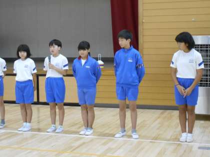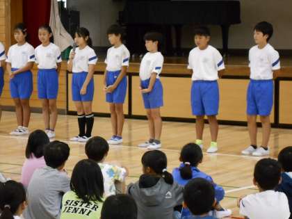 本日の業前活動は、10月10日(木)に実施予定の「藤岡市・多野郡小学校陸上教室記録会」の壮行会でした。出場する選手一人一人が意気込みを発表しました。大会当日は、他校の選手と一緒に楽しく競技してほしいと思います。