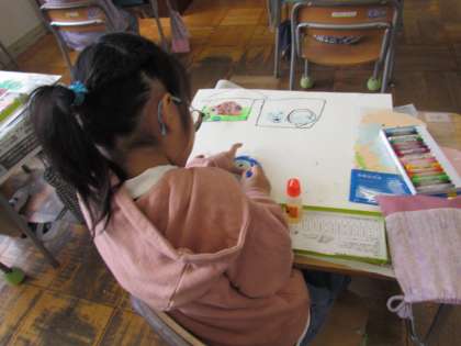 色紙を手でちぎって、さまざまな形を作ります。その形から想像して、いろいろなものにしていきました。動物だったり、車だったり、木だったり、形から想像し、そのあとは自分の好きなものにちぎっていました。画用紙の中にどんな世界ができたかな?