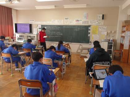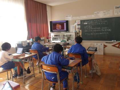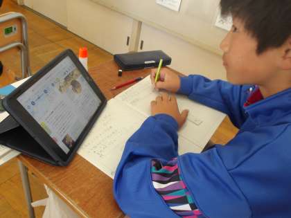 デジタル教科書を使って、授業を進めています。画面の中の資料などに触れるとより詳しい内容が書かれている画面が出てきて、わかりやすくなっています。