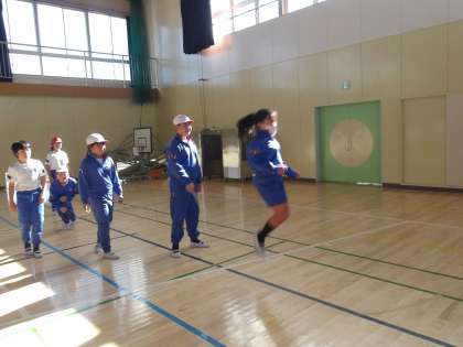 【長なわ】を団に分かれて跳んでいます。最初はなかなか続けて跳べませんでしたが、練習しているうちに上手に跳べるようになってきました。