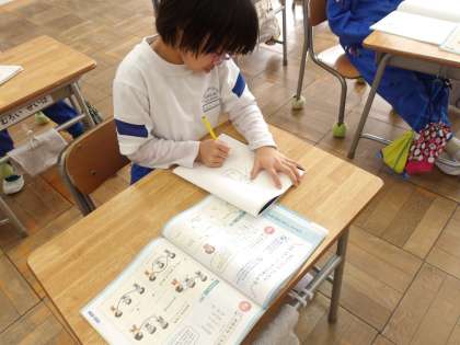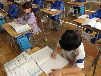 【日本の歌を楽しもう】というめあてで、わらべうたを楽しく歌ったり、聞いたりしていました。そして「さんちゃんが〜」と歌を歌いながら、たぬきの絵を描きました。たくさん描いて、歌もしっかり覚えたようです。