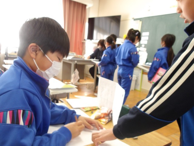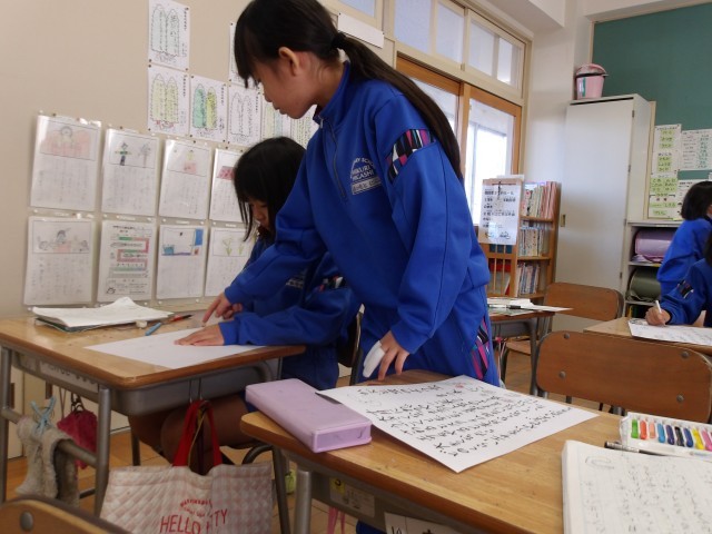 2年生は「詩」を書いています。自分が思ったこと、気づいたことを言葉にして並べていきます。作文との違いがなかなか難しくて、苦戦していましたが,先生や友だちに聞いて考え、書いていました。
