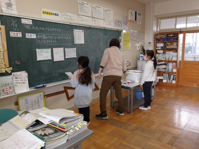 【かけ算のきまりをつかって九九の表を広げよう】が今日のめあてです。9のだんまで覚えて言えるようになった2年生は、今までのかけ算の学習を振り返り、どんなきまりがあったのかを考えています。ノートや教科書を見返して、わかった子がホワイトボードに書き込み、それから全体で共有し、問題に取り組みました。