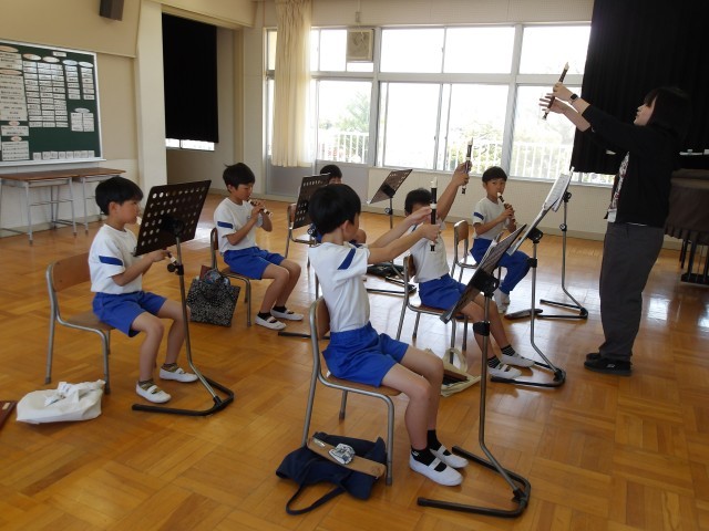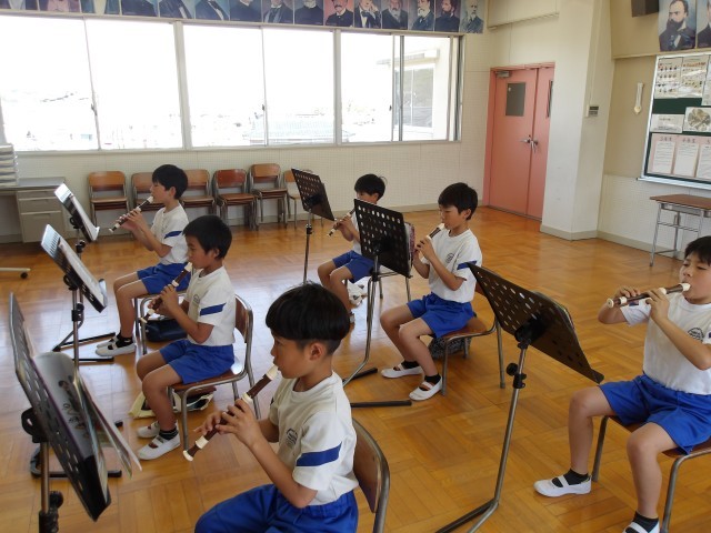 【風のメロディー】という曲をリコーダーで吹いています。低い【レ】や【シ】のフラットが曲の中で出てきて、少し難しくなりました。たくさん練習して、上手に吹けるようになるといいですね。