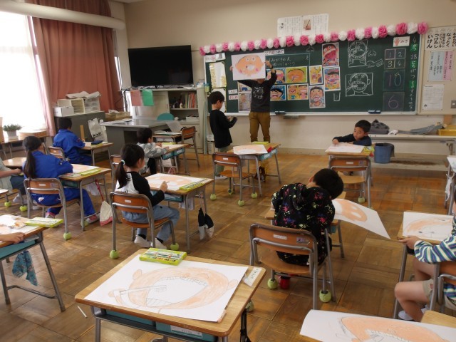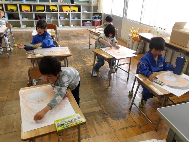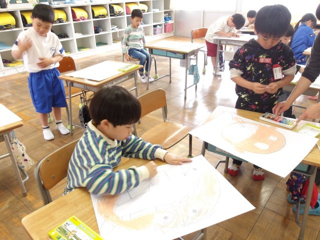 大きな画用紙に自分の顔を描いています。机を縦にしたり、立ち上がって色を塗ったりしています。みんな生き生きと自分の思い通りに【むし歯予防ポスター】が仕上がりそうです。