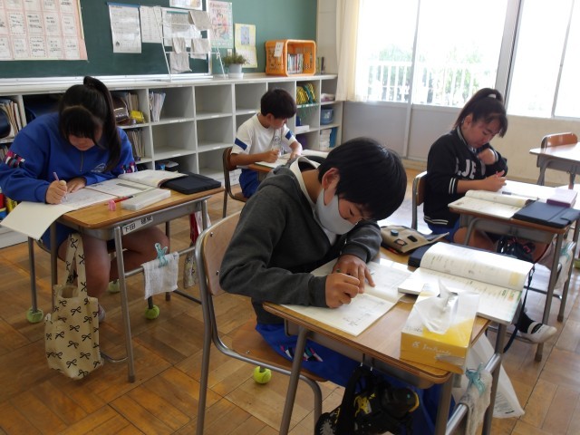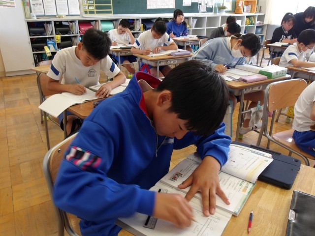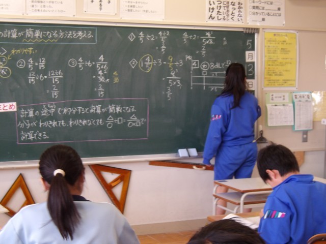 【分数の計算が簡単になる方法を考える】というめあてで、学習しています。今日は分数のわり算について、途中で約分すると簡単になることを学んでいました。
