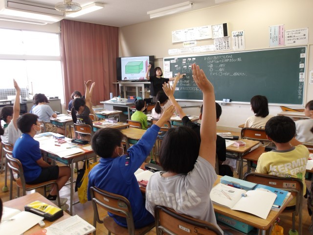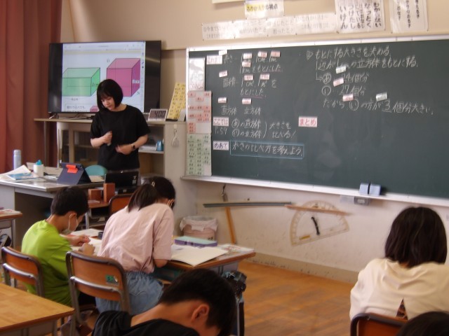 5年生と6年生は【算数】の図形の学習です。5年生は立体模型を使ってよりわかりやすく、6年生は円の面積を求めるための方法を視覚を使って考えていました。