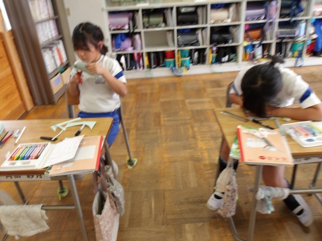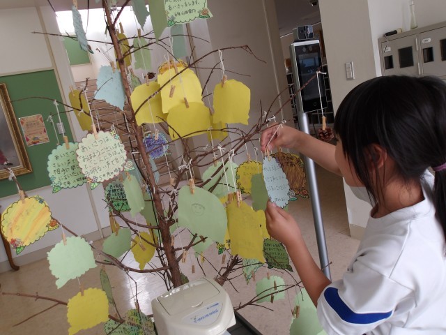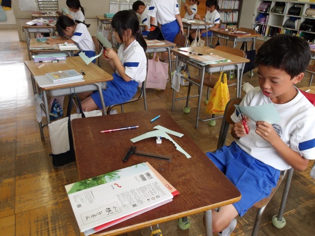 3年生が人権の木に飾るお花作りをしていました。どんなあいさつをしたいか、自分で考えて書き、きれいに色を塗って飾っていました。