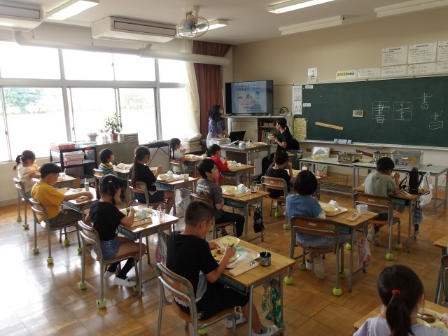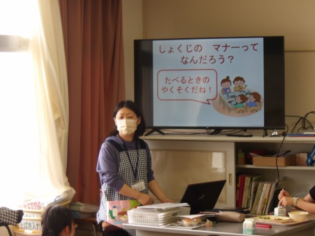 今日の給食の時間に、給食センターの栄養士さんが2年生に給食指導をしてくれました。内容は「しょくじのマナー」です。食事のマナー=食べるときの約束。これから食事をするとき食事のマナーにも気をくばっていきましょう。