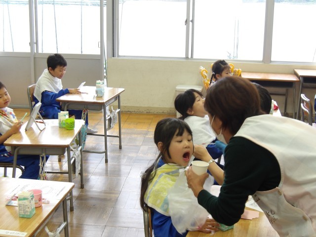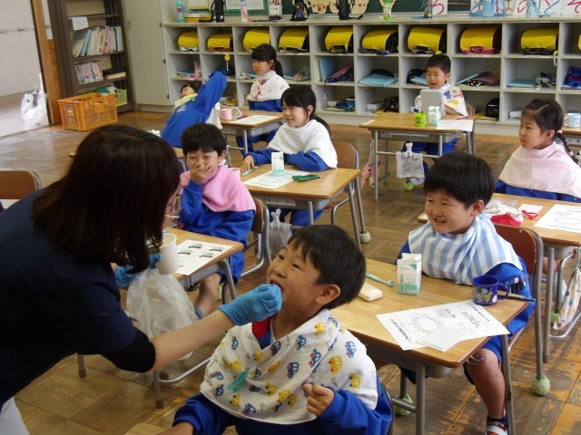本日2校時、歯科衛生士さんと保健師さんが来校し、1年生に歯みがき指導をしていただき、具体的なブラッシングの方法などを学びました。