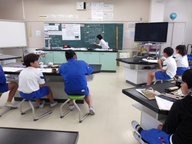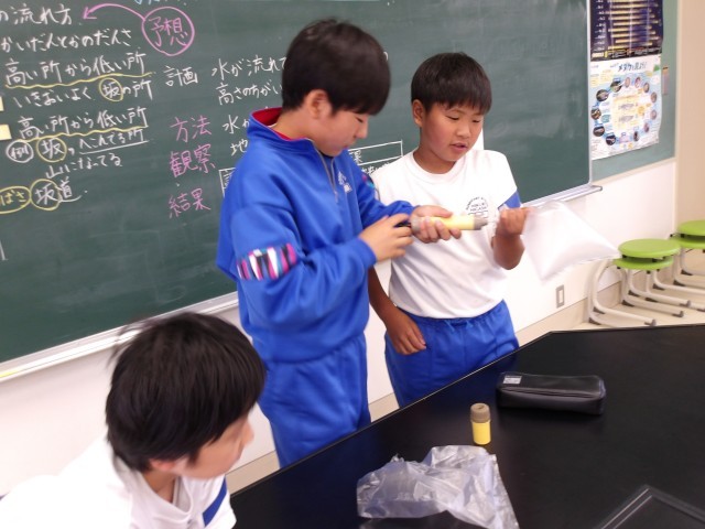【吸う空気とはく空気】の学習です。自分たちがはいた空気にどのくらい二酸化炭素が入っているか、実験をしています。気体検知管を使って二酸化炭素濃度を確認していました。