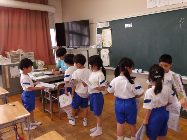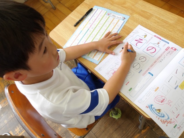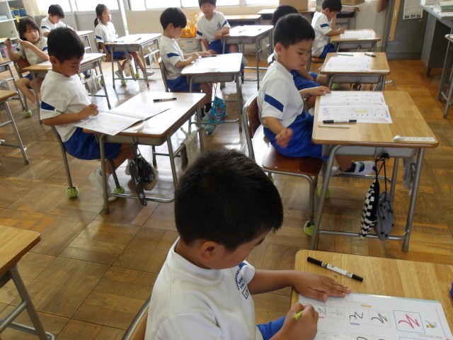 1年生は【ひらがな】全部の文字の学習が終わり、このあとは小さな「つ」「よ」などを学習していきます。今日は姿勢よく、鉛筆の持ち方などを気をつけながら書写をしています。ゆっくり丁寧に、がとても大切です。できると先生のところに行ってまるをもらったり、直してもらったりしてどんどんできるようになっていきます。
