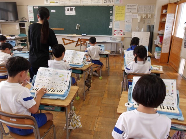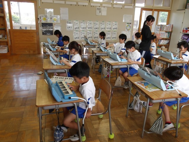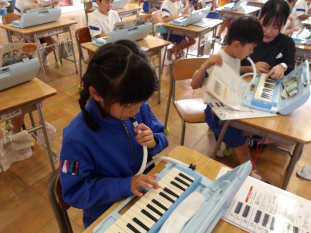 【かえるの合唱】を鍵盤ハーモニカで演奏しています。決まった指をつかうのが難しい子もいますが、鍵盤とにらめっこしながら練習です。先生の話や指示をしっかり聞いて取り組めると上手になります。