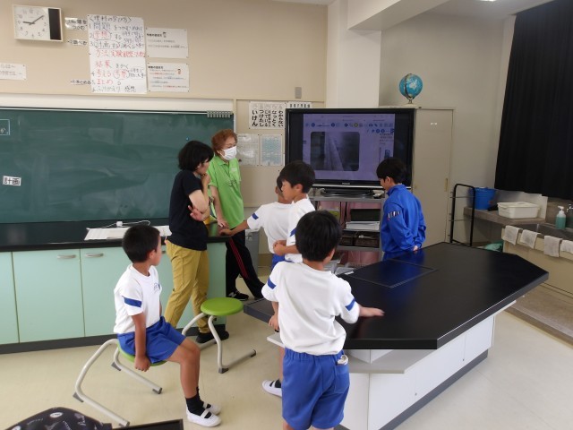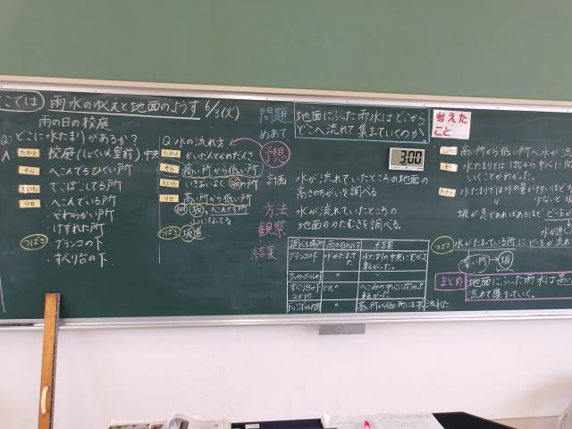 【天気と気温】タブレットを使って前時にそれぞれの班で行った実験結果の考察を行い、地面に降った雨の流れ方について意見を出し合いながら学びを深めました。